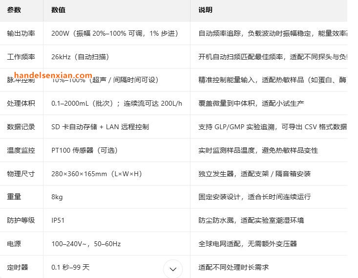 分体式结构:发生器与换能器分离,适配支架 / 隔音箱固定安装,可 24/7 满负载连续运行,避免手持疲劳,提升实验重复性。